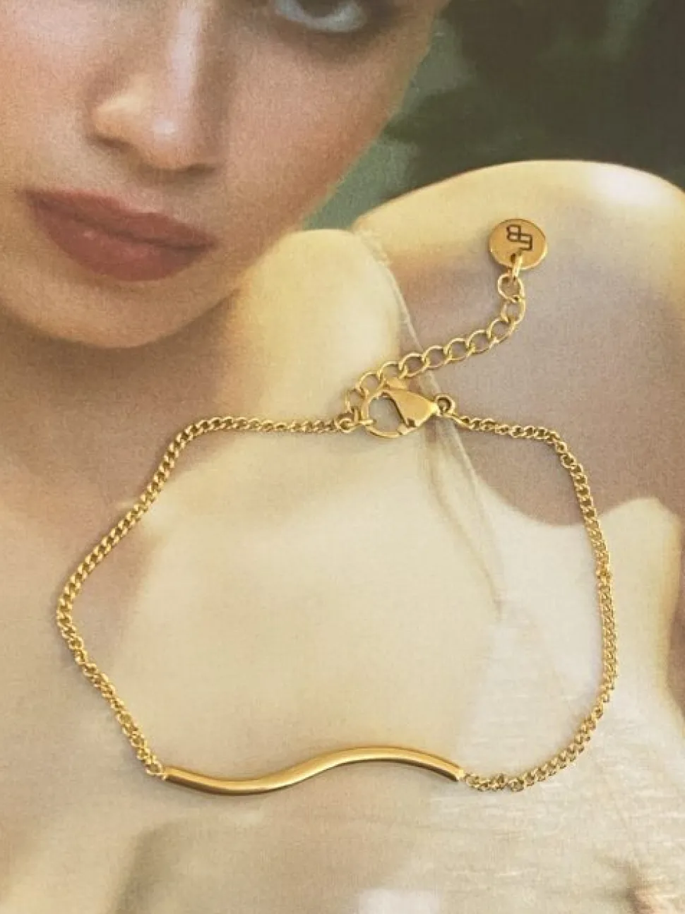 Fijn armbandje verguld met wave. In lengte verstelbaar met EB tag. Goldplated op recycled messing.