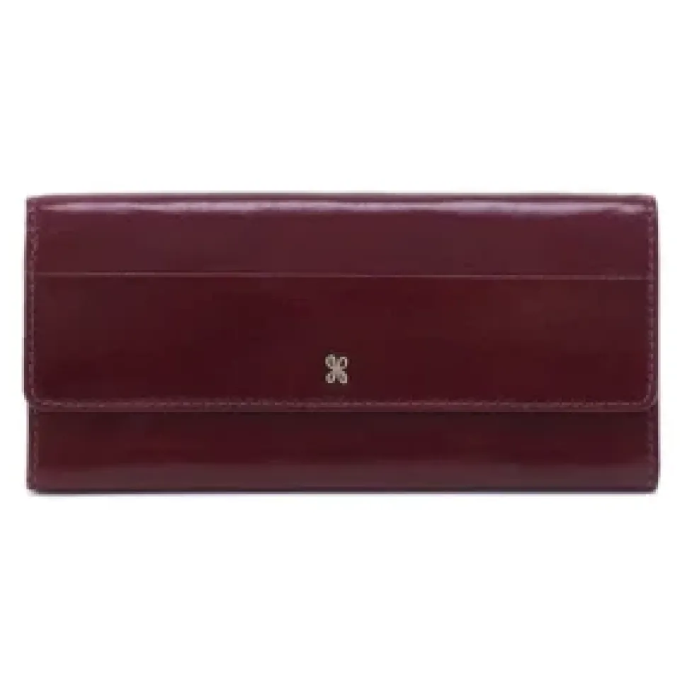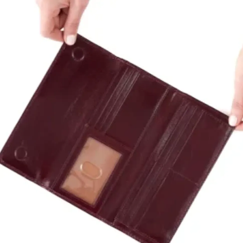 De lederen jill portefeuille vouwt helemaal open en onthult plaats voor kaarten, biljetten en munten. De portefeuille gesloten aan de hand van een drukknop.