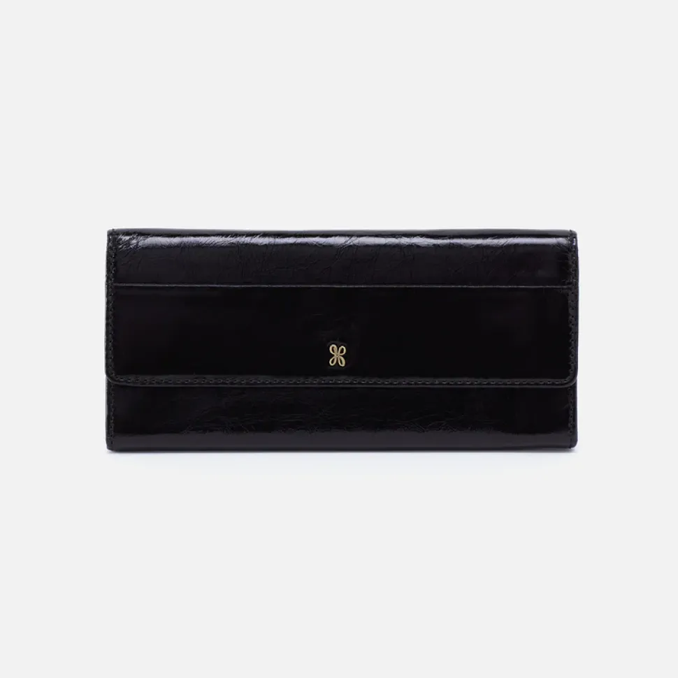 De lederen jill portefeuille vouwt helemaal open en onthult plaats voor kaarten, biljetten en munten. De portefeuille gesloten aan de hand van een drukknop.