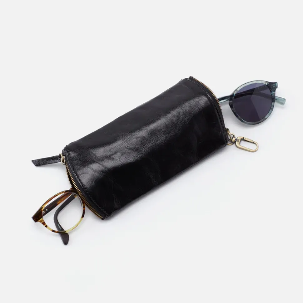 Lederen brillenzakje waar 2 (zonnen)brillen inpassen zonder dat ze elkaar raken. Makkelijk vast te haken aan je favoriete tas.