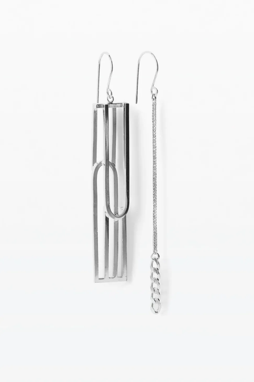 Een asymmetrische statement oorbel die stoerheid uitstraalt, waar stijfheid naadloos samengaat met vloeiende patronen en strakke lijnen, waardoor een onderscheidend en artistiek ontwerp ontstaat.