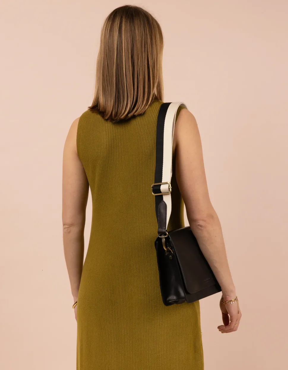 Transformeer je handtas met onze gestreepte singelband van GOTS-gecertificeerd gerecycled katoen en glad klassiek leer. De tweekleurige witte en zwarte kleur past bij elke outfit en maakt het statement waarnaar je op zoek bent. Handige hondenhaken zorgen voor een moeiteloze verwisseling. Voeg deze riem toe aan elke tas, onze favorieten zijn Audrey en Bobbi Midi