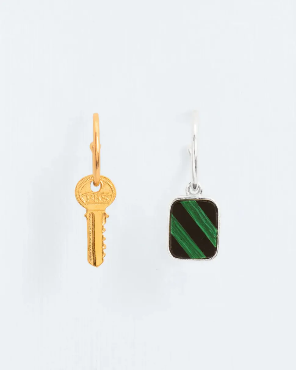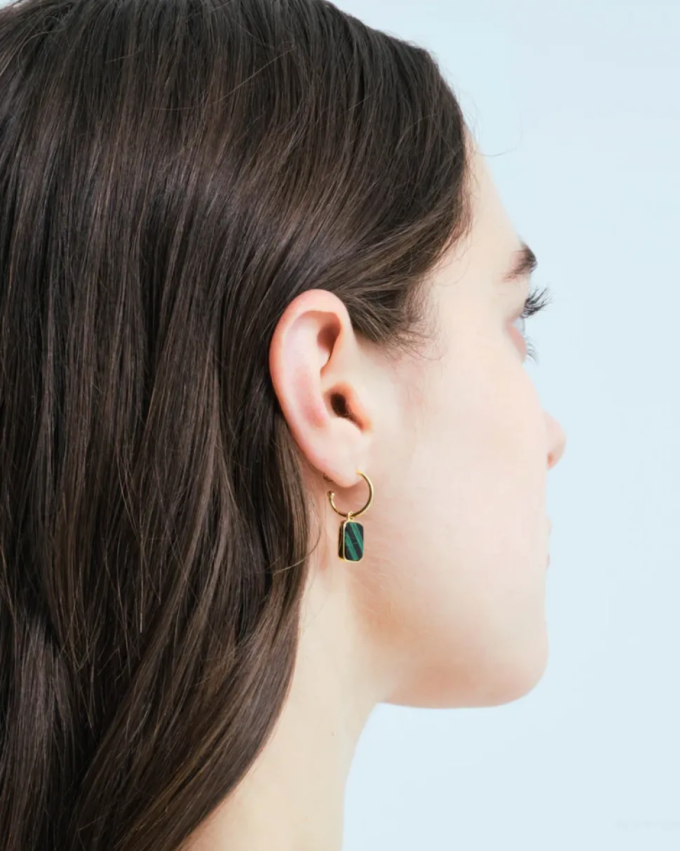 De minimalistische oorring laat de malachiet stralen, zeker in contrast met de onyx. Een eeuwenoude schoonheid die al paleizen heeft versierd.