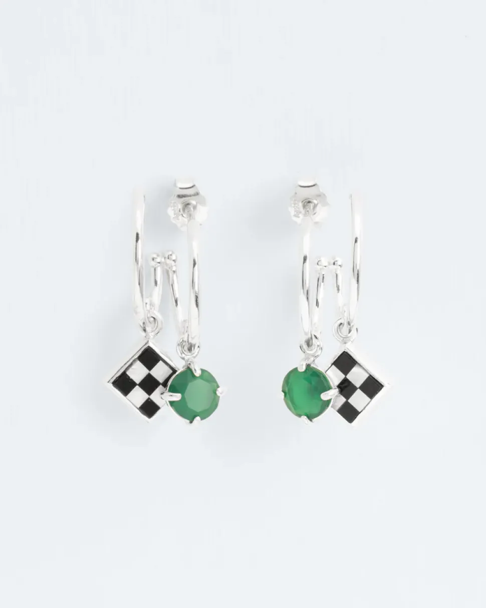Het idee van deze oorbellen is gebaseerd op het trompe l’oeil-effect door gebruik te maken van de dubbele hoepels. Eén juweel dat op twee lijkt. Het mozaïek contrasteert met een weelderige groene agaat. Het schaakbord in de collectie ‘La Fête des Bêtes’ is een verwijzing naar Man Ray en Marcel Duchamp.